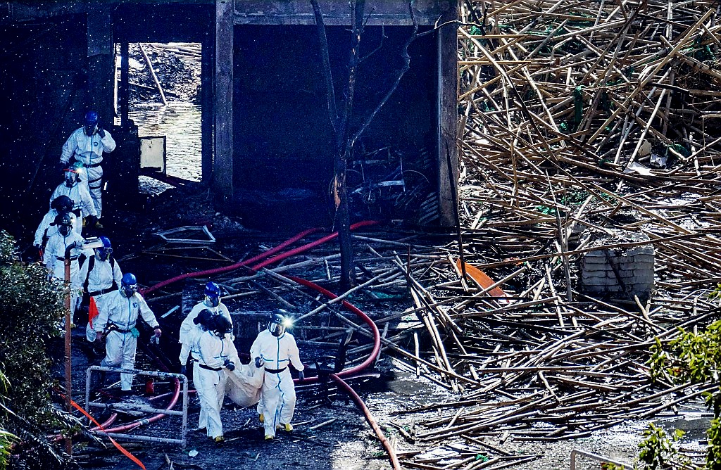 बाहिरी भित्ताहरूमा जडित जलिरहेका बाँसका पोलहरु भाँचिन थालेपछि सिंगो स्काफोल्डिङ संरचना नै गर्ल्यामगुर्लुम ढल्यो। खसेको बाँसको पोलले लागेपछि एक जना अग्निनियन्त्रक बेहोस भएर ढलेपछी उनलाई अस्पताल भर्ना गरिएको थियो ।