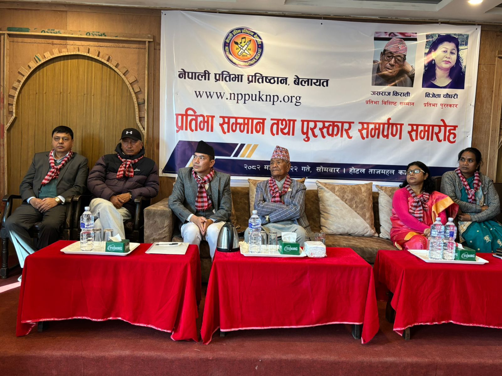 नेपाली भाषा, साहित्य र सिर्जनशीलतालाई प्रवासबाटै प्रवद्र्धन गर्दै आएको नेपाली प्रतिभा प्रतिष्ठान, बेलायतद्वारा आयोजित “प्रतिभा सम्मान तथा पुरस्कार समर्पण समारोह–२०२५” सोमबार काठमाडौँको बागबजारमा भव्यतापूर्वक सम्पन्न भएको छ । कार्यक्रमका प्रमुख अतिथि वरिष्ठ कवि तथा मुन्धुमविद् बैरागी काइँला रहेका थिए भने सभाध्यक्ष संस्थाका उपाध्यक्ष मिजास तेम्बेले रहेका थिए ।