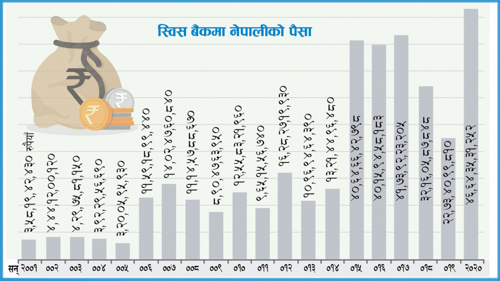 काठमाडौँ — गम्भीर अपराध तथा गैरकानुनी कार्यबाट आर्जित रकम बचत गरिदिने र उच्चस्तरीय गोपनीयता राख्ने स्विस बैंकमा नेपालीको मौज्दात रकम बढेको छ । स्विस नेसनल बैंकले सार्वजनिक गरेको पछिल्लो विवरणअनुसार स्विट्जरल्यान्डका बैंकमा सन् २०१९ को तुलनामा २०२० मा नेपालीको बचत दोब्बर भएको छ ।